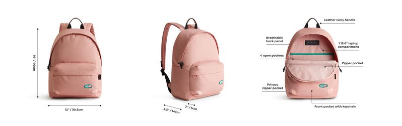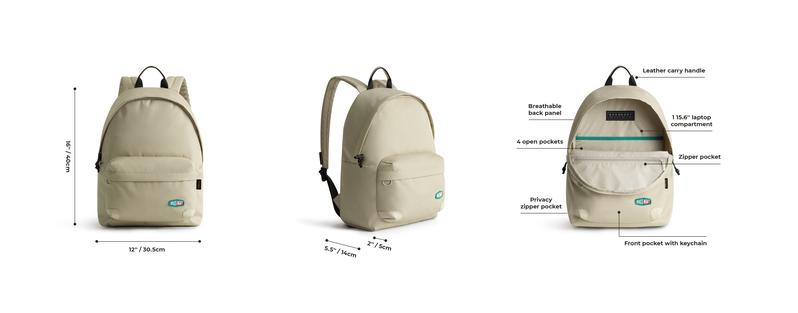 The Ocean Daypack includes a 15.6-inch laptop compartment, an interior zipper pocket, and two open pockets with pen slots. It provides organized storage for tech devices and everyday essentials, perfect for students and professionals.