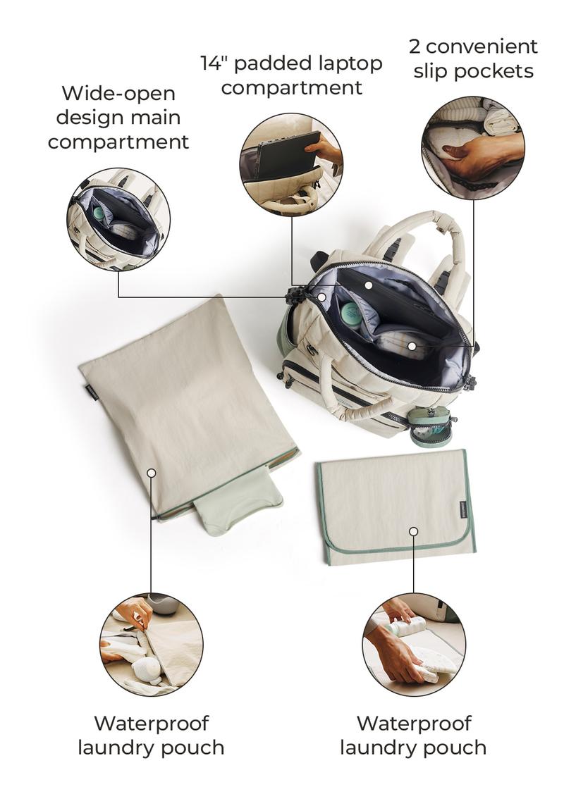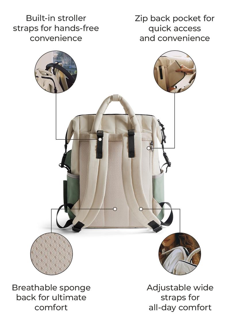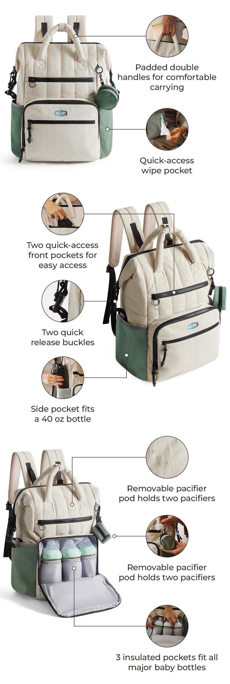 Includes a pacifier case, changing pad, and waterproof laundry pouch. The detachable pacifier case keeps your baby’s pacifier handy. An insulated bottle bag keeps bottles warm. A quick-access tissue bag is perfect for messes. A laptop compartment fits a 14-inch laptop, supporting multitasking.